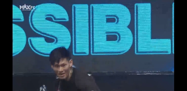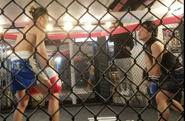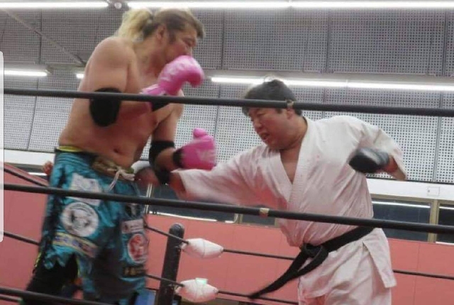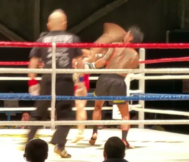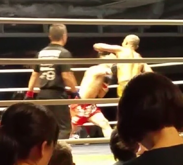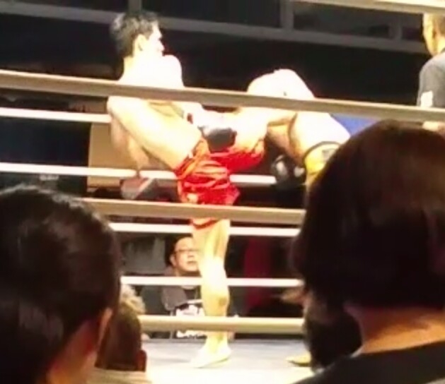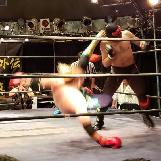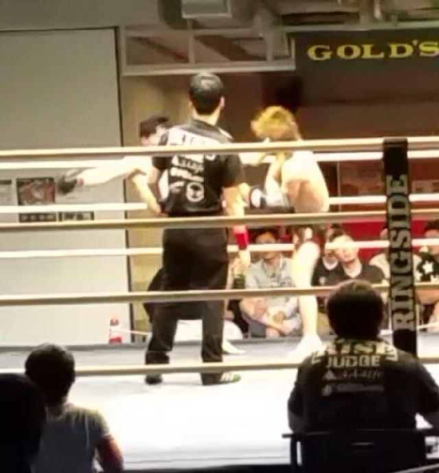 まぁ下ばっかり見てるからローキックはよけれるけどパンチはよけられず、もらって目線が上にいったらローキックよけられずまともにもらい倒れたけどスリップになり、スタミナも無くなり足もきいて動けないから最後は自らアゴを差し出してものの見事に右ストレートをもらい1RKO負け。